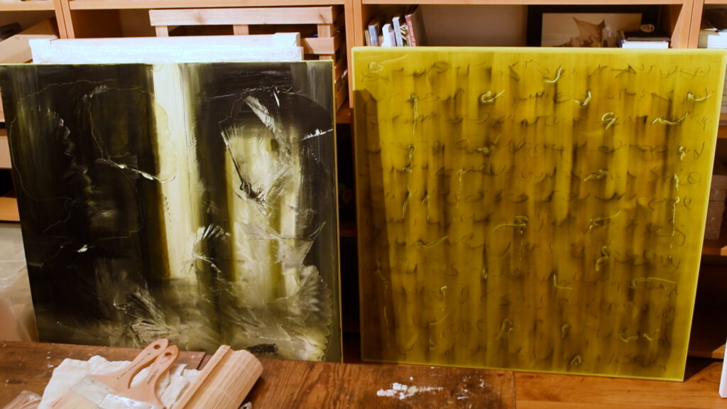 Her process reflects this belief. She describes receiving her paintings rather than actively constructing them. Much of her work happens in silence, meditation, prayer, reading, visiting museums, speaking with others, drawing, and allowing herself to simply receive. When the moment arrives, she retreats fully into her studio, sometimes painting until three in the morning. She sees herself not as the one deciding, but as someone available to what comes through. She refers to herself as the servant of the work, with a clear purpose rather than personal control.